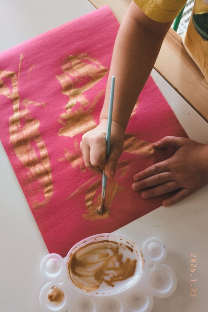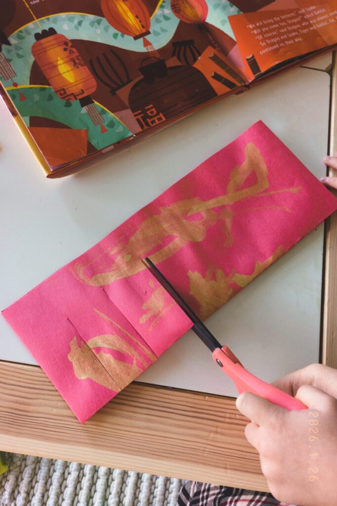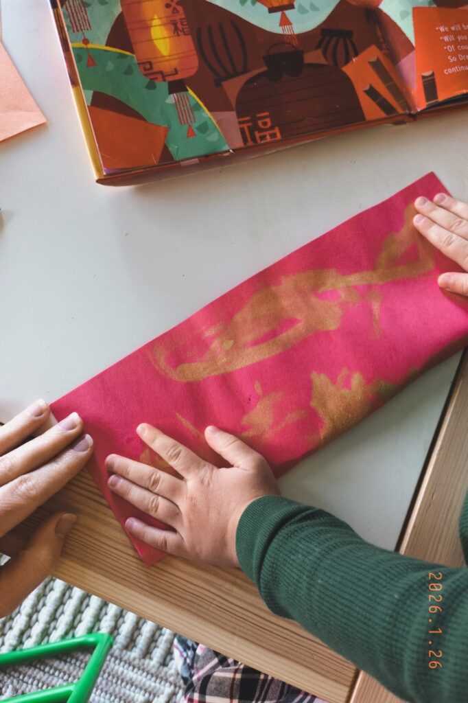 - Decorate first: Have your child paint some designs on their red construction paper. We used gold paint, to mimic the light illuminating the lantern! Allow to dry before moving on.