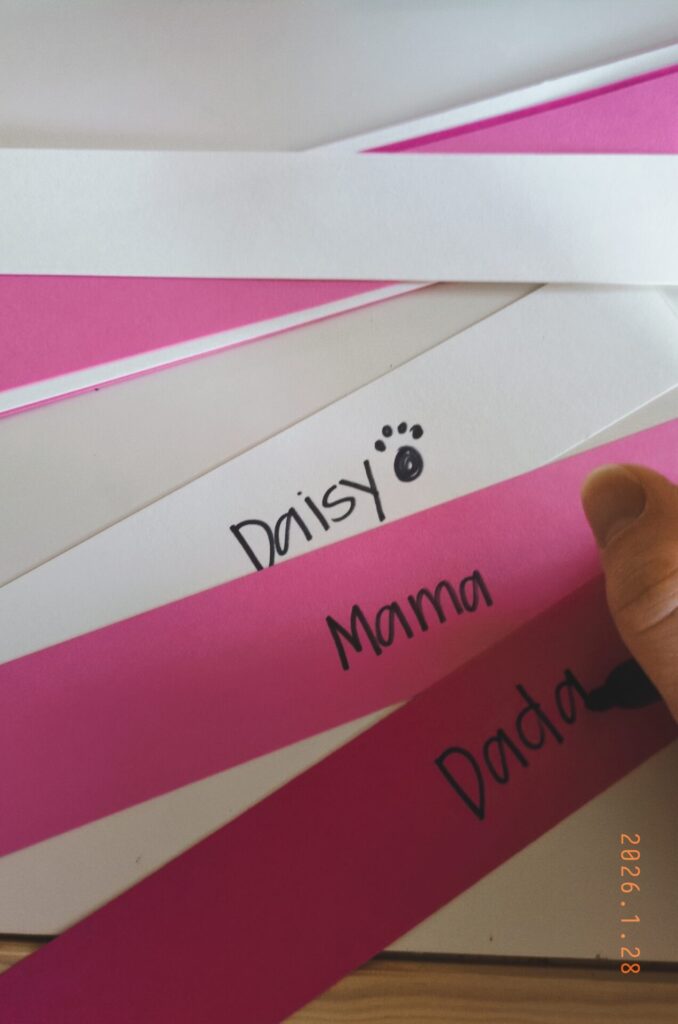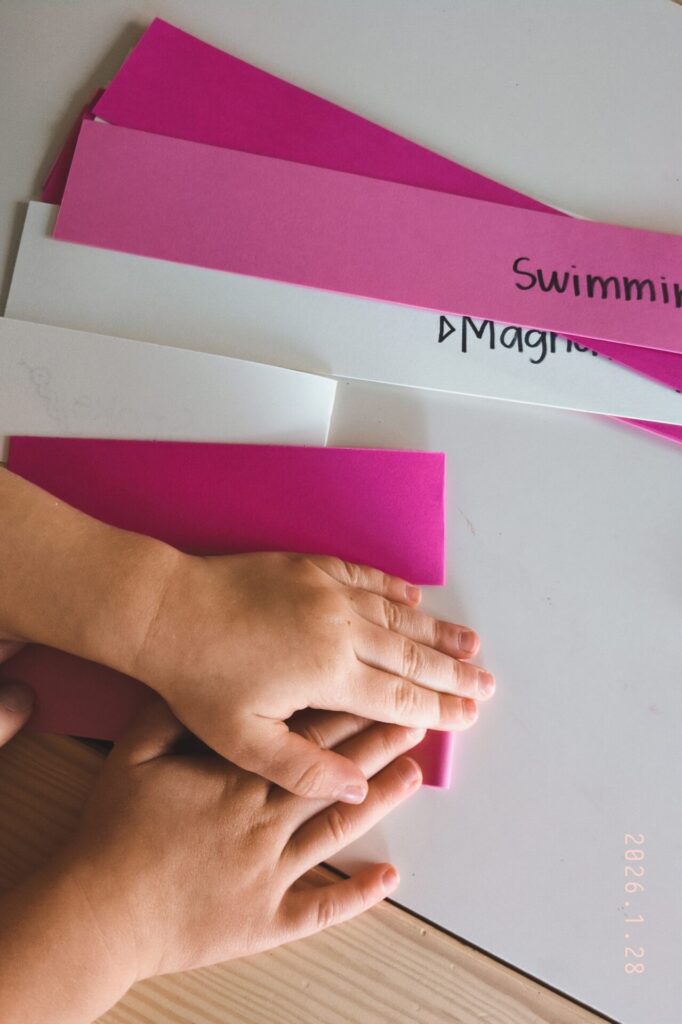 - Let’s talk about love: Ask your little learner about the things they love! You can ask guiding questions about people they love, activities they love, or even foods they love! š Write one down on each strip of paper.