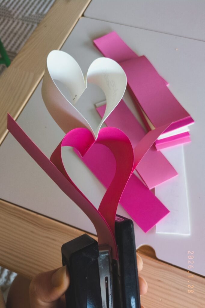 - Staple like crazy: Taking the two open ends of one strip of paper, twist them inwards on themselves and staple together (this should make a rough heart shape, as seen in the following pictures). Then grab your next strip of paper and line the fold up with the bottom of the previous heart, and staple together there. Pull the ends outwards and together, to make another heart shape. Repeat this process to continue the chain!